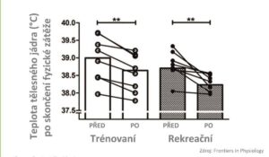 Zde je graf z citované studie, který ukazuje teplotu tělesného jádra testovaných sportovců na konci 40minutového běhu běhu v horku před a po protokolu s horkou vanou: